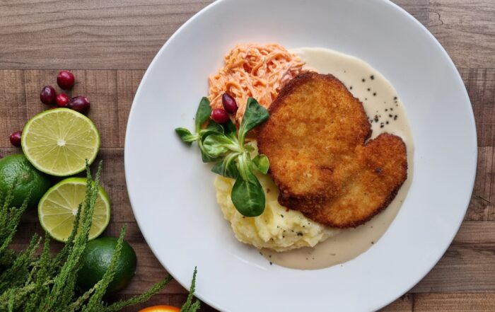 Paneeritud sealihašnitsel, kartulipuder, porgandi-majoneesisalat, soe kaste