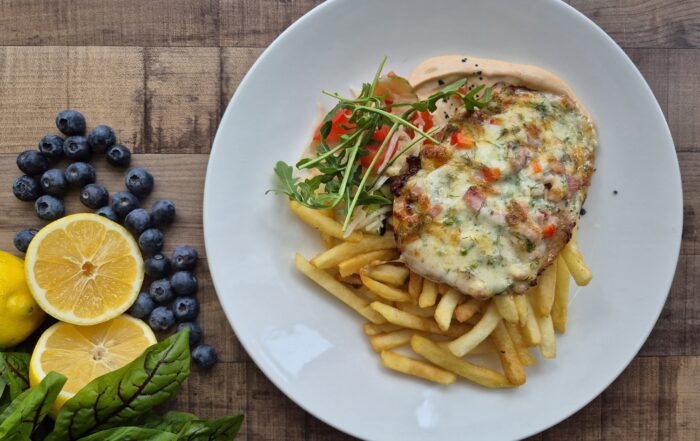 Peekoni-juustukattega sealiha, friikartul, grillsalat, külm kaste
