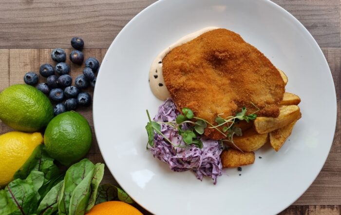 Laetud šnitsel kartulilaastude, punase sibula ja tar-tar kastmega 13,50€