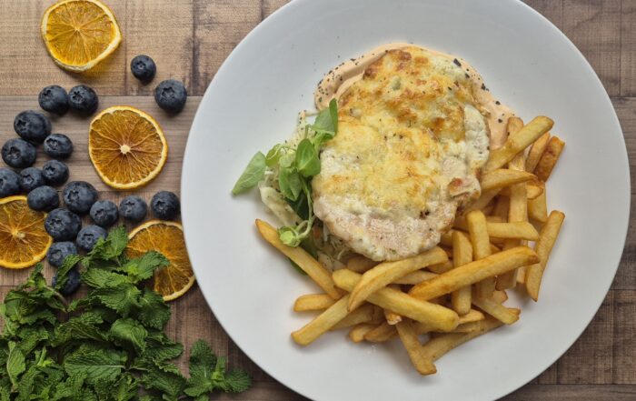Küüslaugu-juustukattega sealiha, friikartul, kapsa-ürdi salat, külm Chipotle-majoneesikaste