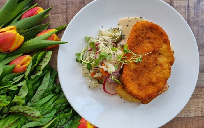 Sealihašnitsel, sektorkartul, kapsa- ürdisalat, soe kaste