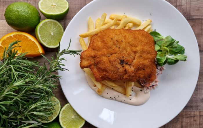Kõvajuustu kattega kanafileešnitsel üleküpse kartuli 14,90€