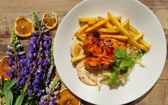 Sweet chilli marinaadis kanaliha, friikartul, värske salat, külm kaste
