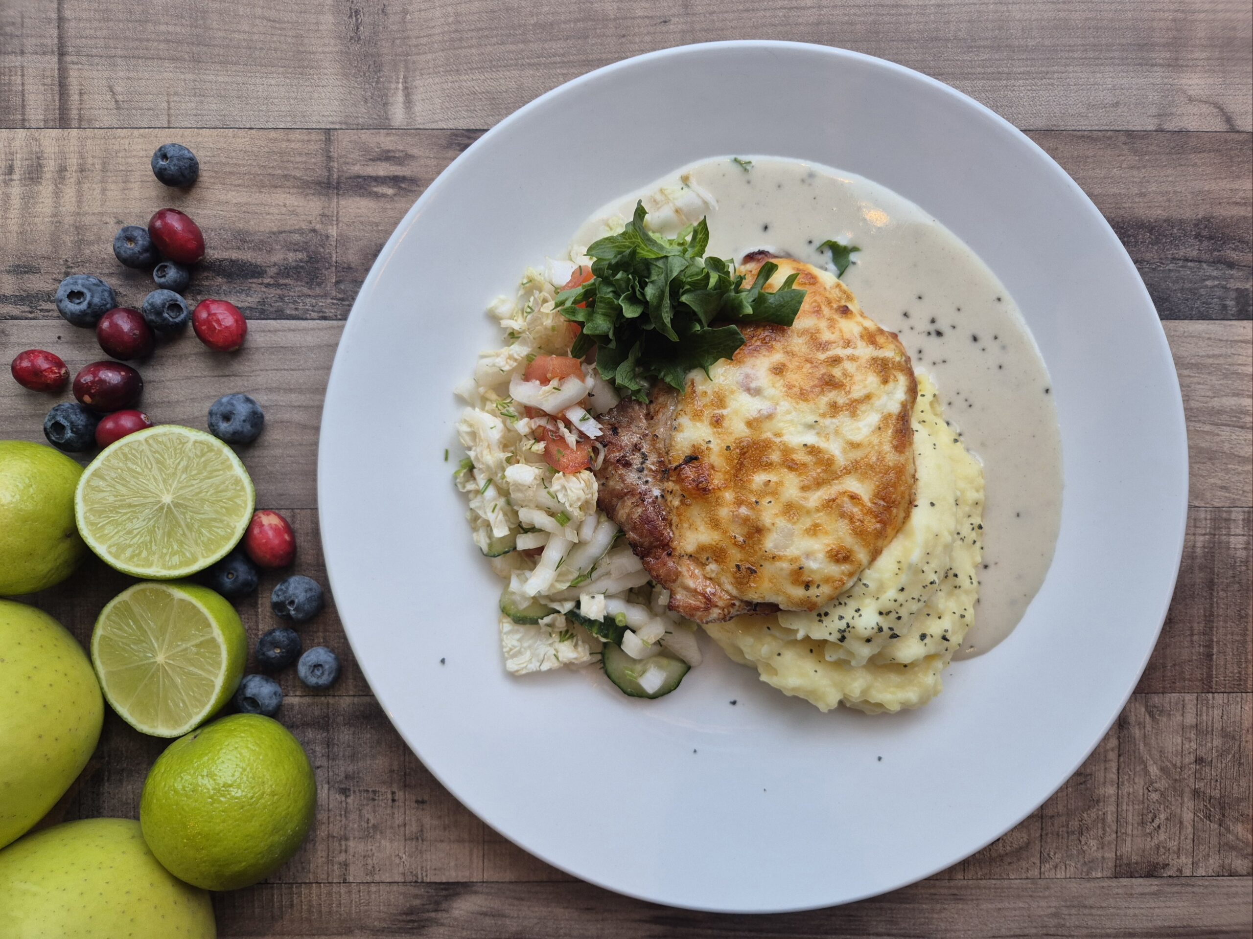 Küüslaugu-juustukattega sealiha, kartulipuder, hiinakapsa salat, soe kaste