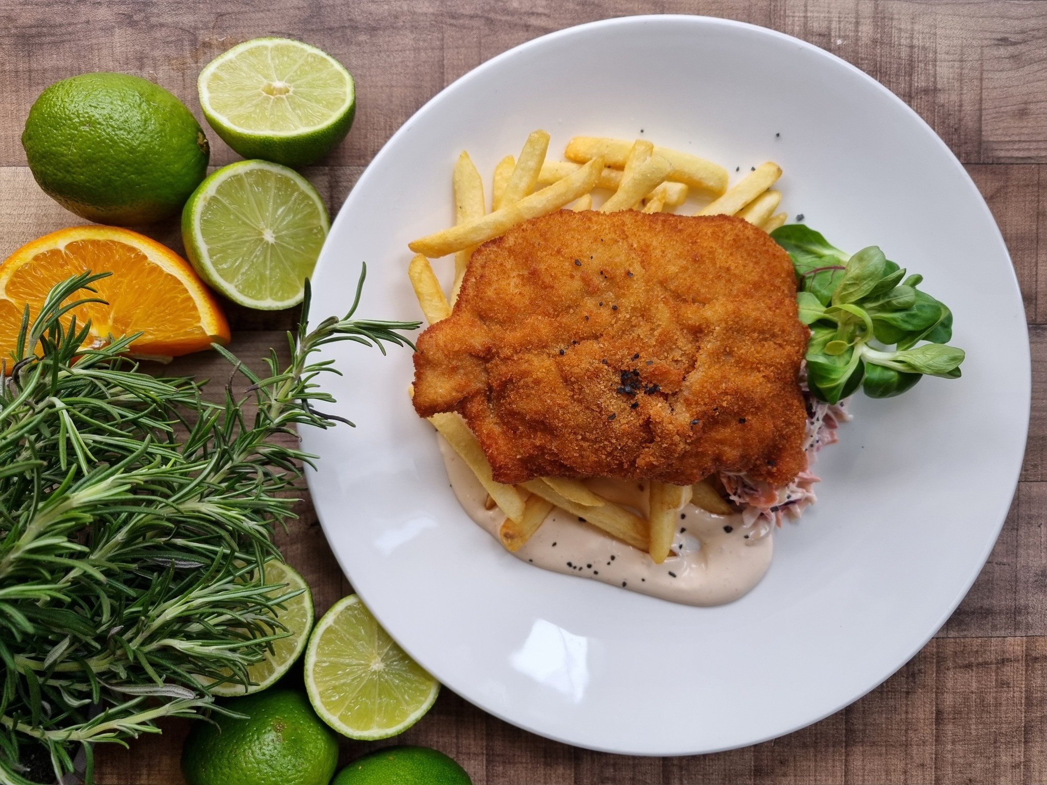 Paneeritud sealihašnitsel, friikartul, Coleslaw salat, külm kaste